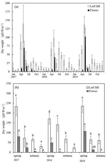 Monthly (a), and seasonal (b), dry weight of leaf fall and flower (gD·W·m−2) from January 2017 to December 2019. The bars marked with different letters are significantly different at the p < 0.05.
