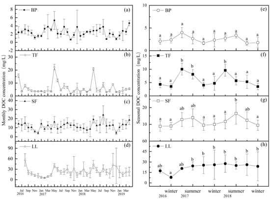 Monthly DOC concentration (mg/L) of (a) bulk precipitation (BP), (b) throughfall (TF), (c) stemflow (SF), and (d) litter leachate (LL), from June 2016 to April 2019. Seasonal DOC concentration (mg/L) of (e) bulk precipitation (BP), (f) throughfall (TF), (g) stemflow (SF), and (h) litter leachate (LL), from autumn in 2016 to winter. The points marked with different letters are significantly different at the p < 0.05.