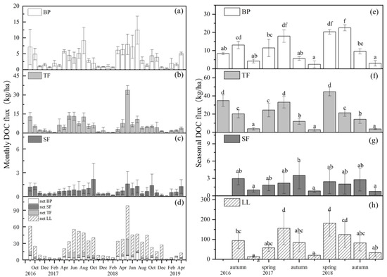Monthly DOC flux (kg/ha) of (a) bulk precipitation (BP), (b) throughfall (TF), (c) stemflow (SF), and (d) proportion of net DOC in different water from September 2016 to April 2019. Seasonal DOC flux (kg/ha) of (e) bulk precipitation (BP), (f) throughfall (TF), (g) stemflow (SF), and (h) litter leachate (LL), from summer in 2016 to winter in 2018. The bars marked with different letters are significantly different at the p < 0.05.