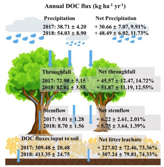 Forest canopies generate patterns of DOC-enriched hydrological fluxes (both throughfall and stemflow), which are influenced by the interactions between biotic (e.g., canopy phenology) and abiotic (e.g., meteorological conditions) factors []. The canopy state (e.g., the leaf area index and canopy structure) and precipitation event type have been found to be crucial indicators of both throughfall and stemflow production [,,]; for example, the fact that the stemflow amount is larger in a leafless season for various tree species [,,,,]. Beyond that, numerous studies have investigated and defined the DOC in throughfall (5–200 mg C L−1) and stemflow (1–100 mg C L−1) in forest ecosystems at local, regional, and national scales [,,,,,,,,]. Throughfall and stemflow DOC likely percolate slowly through the litter layer and soil matrix where much of it may be consumed or absorbed under low-to-moderate rainfall []; however, they can be delivered to the downstream and throughfall precipitation which contributes significantly (30%-80%) to streams under heavy rainfall conditions [,,,]. These findings indicate that tree-DOC (the DOC in throughfall and stemflow precipitation) is a quantitatively significant C flux, which is comparable in magnitude to DOC fluxes in aquatic systems. However, it is poorly integrated into models and C budgets for forest and aquatic ecosystems []. Soil is the largest pool of terrestrial organic C in the biosphere, and about 40% of global soil C stocks reside in forests [,]. Soil C dynamics could be affected by the selective preservation of labile C inputs from litterfall and roots. The upper organic horizons of podzols are a key source of soil DOC []. Michalzik et al. (2001) [] showed an extensive range in the values of litter leachate DOC fluxes (0.1–0.4 t ha−1 yr−1) in a studied temperate forest ecosystem; meanwhile, the mean organic carbon pool was up to 156.6 t ha−1 in the temperate forest []. Although the proportion of litter leachate DOC flux in the soil carbon pool appears small, DOC as a labile C has a higher turnover rate and is considered an early indicator of soil organic carbon (SOC) changes [,,]; furthermore, it represents 66%–91% of the yearly organic C input into mineral soil []. Hence, forest litterfall plays a pivotal role in the interaction between plants and soil, and the DOC from the biological degradation of plant residues and litterfall leaching are important for soil active organic carbon [,].