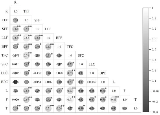 Annual DOC flux (kg ha−1 yr−1), net DOC flux (kg ha−1 yr−1), and contribution of net precipitation, throughfall, stemflow, and litter leachate DOC fluxes to the annual DOC flux input to soil. The numbers marked with ** and * indicate the correlation was significant at the p < 0.01 and p < 0.05, respectively.