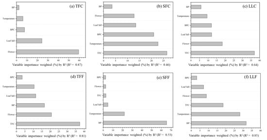 Variable importance weighted by R2 for (a) throughfall concentration (TFC), (b) stemflow concentration (SFC), (c) litter leachate concentration (LLC), (d) throughfall flux (TFF), (e) stemflow flux (SFF), and (f) litter leachate flux (LLF). (BPC: bulk precipitation concentration, BP: bulk precipitation amount).