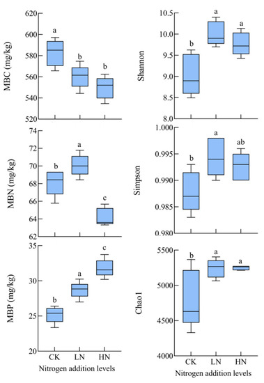 The results of our study revealed a general trend of low level promotion and high-level inhibition of MBN content. The MBN content was lower for high nitrogen addition than for the control, and the highest MBN content was found for low nitrogen addition (p < 0.05). Such a pattern was also found in the study of others [28], where low levels of nitrogen addition had a positive effect on MBN, while high levels had a negative effect. However, it has also been shown [29] that the level of MBN increases with increasing nitrogen addition. This is similar to our findings. It is possible that at the beginning of nitrogen addition, the nitrogen content in the soil increased to meet the microbial demand for nitrogen, which promoted the decomposition and utilization of soil organic matter by microorganisms, thus increasing the MBN content. However, as the nitrogen addition continued, it reduced the microbial demand for N, which led to a decrease in MBN content [30].