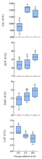 Our results showed that different levels of nitrogen addition enhanced soil urease (Ure), acid phosphatase (ACP), and N-acetylaminoglucosidase (NAG) activities and inhibited leucine aminopeptidase (LAP) activities (Table 2 and Figure 1). Low and high nitrogen additions increased Ure activity by 19.9% and 27.9%, increased ACP activity by 2.0% and 14.9%, increased NAG activity by 5.2% and 10.0%, and reduced LAP activity by 6.8% and 10.7%, respectively. The promotion of Ure, ACP and NAG activities was significantly higher with high nitrogen addition than with low nitrogen addition (p < 0.05), and the inhibition of LAP activity was significantly enhanced with high nitrogen addition (p < 0.05) (Table 2 and Figure 2).