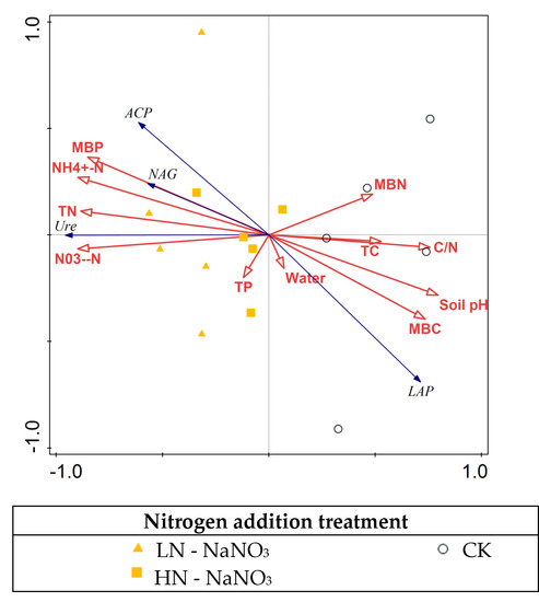 Enzyme production by soil microorganisms follows the economic principle that nitrogen addition decreases the microbial demand for nitrogen and increases the demand for carbon and phosphorus, leading to a decrease in nitrogen hydrolase activity [32,33], which is consistent with the results of most studies. In the present study, nitrogen addition limited the activity of the nitrogen acquisition enzyme LAP due to the increase in soil effective nitrogen content under nitrogen addition conditions, which resulted in a decrease in the activity of enzymes associated with nitrogen acquisition. The results of correlation analysis indicated that the decrease in soil pH after nitrogen addition was the main reason for the decrease in LAP activity. However, contrary to the results of some studies [34], in our study, NAG activity increased in all treatments due to the increased level of nitrogen addition. This difference may be due to the increase in plant biomass after nitrogen addition, which leads to an increase in organic N in the soil and induces NAG secretion.