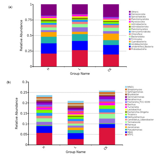 Effect of nitrogen addition on the abundance of bacterial. (a) Bacteria phylum Level; (b) Bacteria genus level. Note: “Others” indicates the sum of the relative abundances of all gates other than those shown in the figure. H: high N addition, L: low N addition, CK: no N addition.