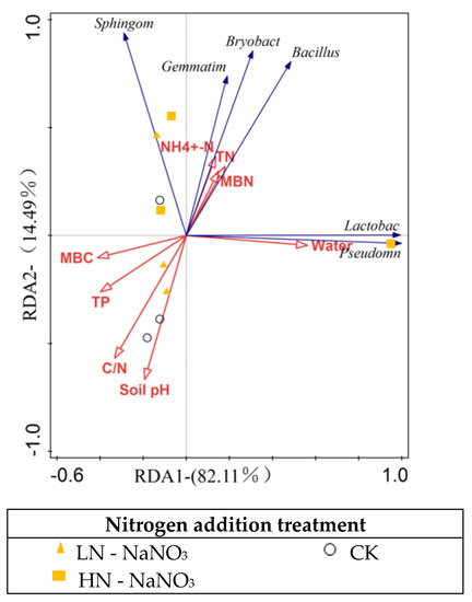 Studies have shown [47,48] that Gemmatimonas belonging to Gemmatimonadetes can be involved in soil organic matter fixation. In our study, both levels of N addition increased the relative abundance of Gemmatimonas, suggesting that N addition may promote the growth and development of Larix olgensis plants, improve the physical properties of the soil, and promote the activity of microorganisms and soil organisms. Pseudomonas belongs to Proteobacteria [49]. Both horizontal N additions increased the abundance of Pseudomonas and this promotion may enhance soil N fixation [49]. Our study also found that nitrogen addition increased the abundance of Bacillus medium, a common bacterial group in soil with high abundance and phosphorus solubilizing ability. It secretes secondary metabolites that induce disease resistance in plants and have a strong probiotic effect [50]. It can form spores and are highly adaptable to the environment; therefore, it can grow and reproduce well when the nutrient content in the subsoil is low [51]. In addition, nitrogen addition promotes the beneficial bacteria Bryobacter, which has the ability to decompose lignin and cellulose, and Sphingomonas, which has the ability to fix nitrogen or promote growth in crop roots. According to correlation analysis, soil pH and soil TP were significantly correlated with the beneficial microflora whose abundance increased after nitrogen addition, and the environmental factors that mainly affected the change in bacterial community structure were soil water content and C/N (Figure 6), which indicated that N addition did change the nutrient status of the soil by affecting the physicochemical properties of the soil.