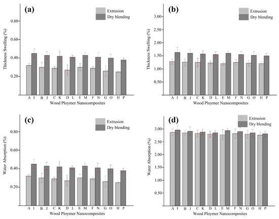 The addition of MAPP greatly increased the dimensional stability of the nanocomposites reinforced with ZnO. As a consequence of the MAPP’s increased coherent interfacial structure between the wood flour, PP matrix, and ZnO nanoparticles, there were fewer microvoids and fiber-polypropylene-ZnO debondings in the interphase area. Similar results were also found by several researchers [10,11,12]. They found that modification of the nanocomposites with MAPP increased their dimensional stability. The production method of wood–polymer nanocomposites is of great importance for the effectiveness of the coupling agent. For example, the nanocomposites produced using the extrusion method have a fixed content of ZnO nanoparticles loading (5 wt%). The WA and TS values were 2.76% and 1.21% lower than those of the dry blending method, respectively.