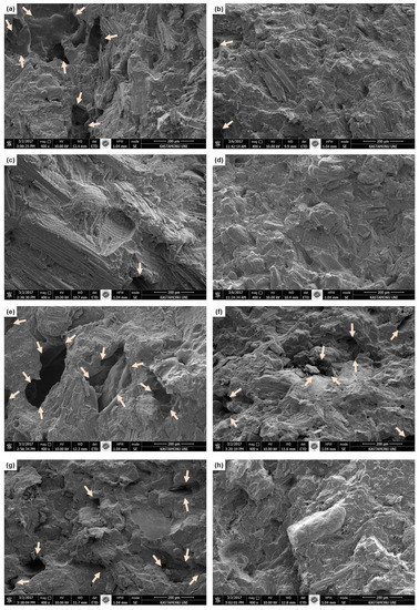 Figure 2 shows SEM micrographs of the fracture surface of the manufactured WPNCs. When SEM micrographs of WPNCs are studied, it is clear that the fracture surfaces of those with MAPP added (Figure 2c,d,g,h) are smoother than those with nano ZnO added (Figure 2a,b,e,f). Large gaps are highlighted with arrows in SEM micrographs of some WPNCs. According to the studies in the literature, these gaps are created by the incompatibility of wood and plastic [16,25,26]. According to SEM micrographs, the most homogeneous distribution of WPNCs occurs in the E, H, and P groups. These findings appear to be consistent with the mechanical test results obtained from the SEM micrographs.