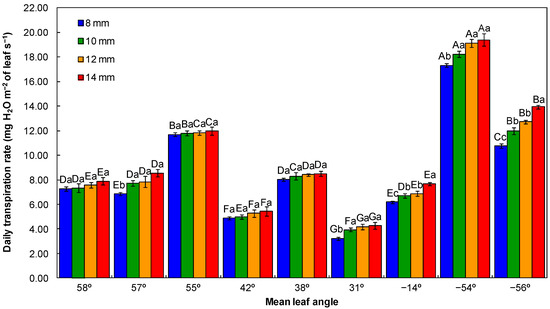 Increasing irrigation volume did not significantly increase daily transpiration rate at 58°, 55°, 42°, and 38° leaf angles. For leaf angles of −54°, 31°, and 57°, the application of a 10 mm irrigation volume increased the daily transpiration rate, which was not significantly different from the larger irrigation volumes. On the other hand, for leaf angles of −14° and −56°, the largest irrigation volume (14 mm) was required to provide a greater daily transpiration rate (Figure 1).