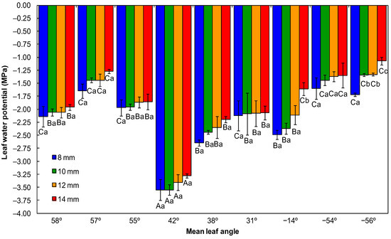 Leaf water potential as influenced by mean leaf angles and irrigation volumes at end of the nursery phase. Croton floribundus (−56°), Heliocarpus popayanensis (−54°), Guazuma ulmifolia (−14°), Esenbeckia leiocarpa (31°), Lafoensia pacari (38°), Moquiniastrum polymorphum (42°), Psidium cattleyanum (55°), Magnolia ovata (57°), and Genipa americana (58°). Different capital letters on the bars indicate significant differences between mean leaf angles at the same irrigation volume by the Scott–Knott test at 5% probability. Different small letters on the bars indicate significant differences between irrigation volumes for the same mean leaf angle by the Scott–Knott test at 5% probability. Error bars denote the standard error.