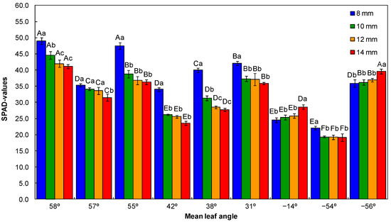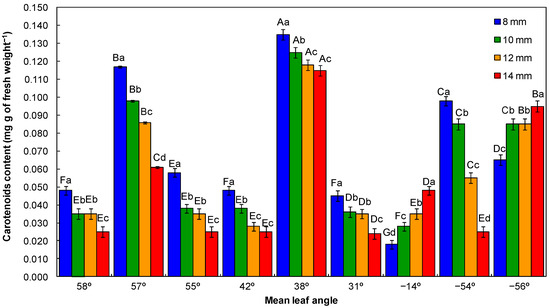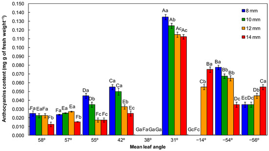 In the ANOVA (Tables S1–S7 available in Supplementary Materials), the significant interaction between irrigation volume and mean leaf angle influenced the leaf water potential, daily transpiration rate, SPAD value, chlorophyll a and b, anthocyanins, and carotenoids content (p < 0.05).