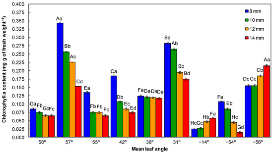 Chlorophyll a content of tree seedlings as influenced by mean leaf angles and irrigation volumes at the end of the nursery phase. Croton floribundus (−56°), Heliocarpus popayanensis (−54°), Guazuma ulmifolia (−14°), Esenbeckia leiocarpa (31°), Lafoensia pacari (38°), Moquiniastrum polymorphum (42°), Psidium cattleyanum (55°), Magnolia ovata (57°), and Genipa americana (58°). Different capital letters on the bars indicate significant differences between mean leaf angles at the same irrigation volume by the Scott–Knott test at 5% probability. Different small letters on the bars indicate significant differences between irrigation volumes for the same mean leaf angle by the Scott–Knott test at 5% probability. Error bars denote the standard error.