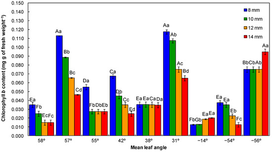 Chlorophyll b content of tree seedlings as influenced by mean leaf angles and irrigation volumes at the end of the nursery phase. Croton floribundus (−56°), Heliocarpus popayanensis (−54°), Guazuma ulmifolia (−14°), Esenbeckia leiocarpa (31°), Lafoensia pacari (38°), Moquiniastrum polymorphum (42°), Psidium cattleyanum (55°), Magnolia ovata (57°), and Genipa americana (58°). Different capital letters on the bars indicate significant differences between mean leaf angles at the same irrigation volume by the Scott–Knott test at 5% probability. Different small letters on the bars indicate significant differences between irrigation volumes for the same mean leaf angle by the Scott–Knott test at 5% probability. Error bars denote the standard error.