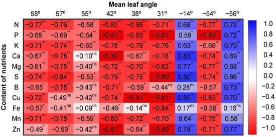 For each mean leaf angle, the Pearson’s correlation coefficient between each total nutrient content and irrigation volume was significant for most nutrients. When significant, for leaf angles of −14° and −56°, the correlation coefficient was positive, i.e., an increase in irrigation volume increased the total nutrient content. For leaf angles of 58°, 57°, 55°, 42°, 38°, 31°, and −54°, the correlation coefficient was negative, i.e., total nutrient content decreased as irrigation volume increased (Figure 8).