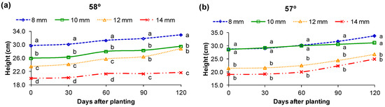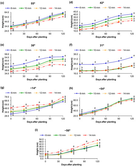 After planting, the effect of the treatments applied during the nursery phase influenced the performance of the potted seedlings to different extents. Regarding height, the effect of irrigation volumes remained significant up to 120 days after planting at leaf angles of 57° and 58°; 42° (90 days); 38°, 31°, and −14° (60 days); and −54° and −56° (30 days). The 55° mean leaf angle was the only one where irrigation volumes differed only at the time of planting (Figure 9).