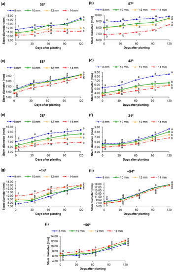 Stem diameter (mm) of tree seedlings until 120 days after planting in pots as influenced by treatments applied during the nursery phase. (a) Genipa americana (58°), (b) Magnolia ovata (57°), (c) Psidium cattleyanum (55°), (d) Moquiniastrum polymorphum (42°), (e) Lafoensia pacari (38°), (f) Esenbeckia leiocarpa (31°), (g) Guazuma ulmifolia (−14°), (h) Heliocarpus popayanensis (−54°), and (i) Croton floribundus (−56°). Different letters on the lines indicate significant differences between irrigation volumes in the same month by the Scott–Knott test at 5% probability.