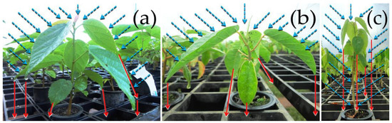 Irrigation water capture by seedling species with negative mean leaf angles. (a) Leaf angle, leaf area, and spatial distribution of leaves in Guazuma ulmifolia (−14°) and (b) Croton floribundus (−56°) hinder the access of irrigation water to the substrate. (c) Leaf angle, small leaf area, and spatial distribution of leaves in Heliocarpus popayanensis (−54°) facilitate the access of irrigation water to the substrate.