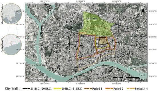 The Yuexiu Hills are a group of natural hills trending northeast–southwest in the northern part of the ancient city of Guangzhou, China. It has a 2000-year history of construction, and the part of the preserved green space is now Yuexiu Park. As their historical boundaries could not be accurately determined, the approximate geographical extent (Figure 2) was mapped based on archaeological information and contemporary road layouts, covering an area of approximately 5110 square meters.