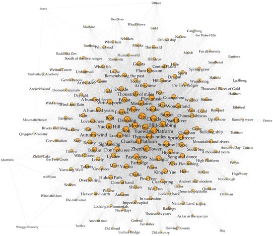 To analyze the associations between various information services and different landscape elements, a semantic network (SN) was constructed based on the retrieved 1063 poems. The SN approach is often used to describe how people understand things in an informative form [33] and has been widely used in studies related to urban design and planning [34,35].