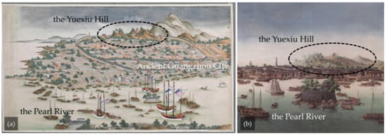 Yuexiu Hill in the ancient paintings: (a) View of Guangzhou (Canton) (part of the painting), around 1760–1770, collected by the British Library. (b) Canton harbor and the city of Canton, around 1760, collected by the British Library.
