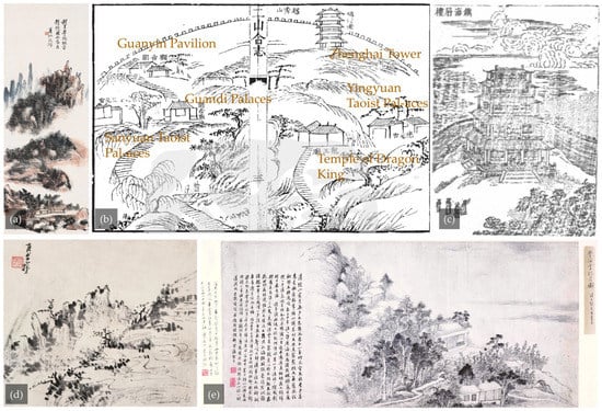 The third category of phrases reflects the types of human elements in the Yuexiu Hill area and includes three subgroups: historic sites, other artificial elements, and historic figures. Over the course of its long history, Yuexiu Hill has not only been a green space for city dwellers to experience nature but also an important place to perceive the city’s history and gain local identity. The 26 historic sites are mentioned several times in the text and are arranged in Table A3 according to when they were built. Among them, “Yuewang Platform”, “Chaohan Platform”, “Yuewang Well”, and “Zhenhai Tower”, which were built in the early period of its history, are more frequently mentioned. The existence of some historic sites can be confirmed in the ancient paintings that have been preserved to this day (Figure 5). In addition to these clearly named historic sites, the poetry database also contains frequent references to human-made elements such as “high buildings”, “high platforms”, “ancient roads”, and “gardens”, as well as historical and mythological figures such as the “King of Yue” and “Lu Jia”.
