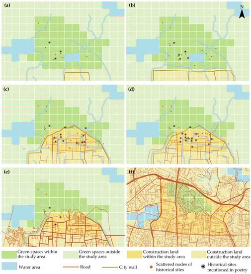Historical mapping evidence for Yuexiu Hill dated (a) The Sui and Tang Dynasties: 581 A.D–959 A.D, (b) The Song and Yuan Dynasties: 960 A.D–1367 A.D, (c) The Ming Dynasties: 1368 A.D–1615 A.D, (d) The Qing Dynasties: 1616 A.D–1911 A.D, (e) The Republic of China: 1912 A.D–1949 A.D, with (f) present situation. (Square grid: 250 m ∗ 250 m).