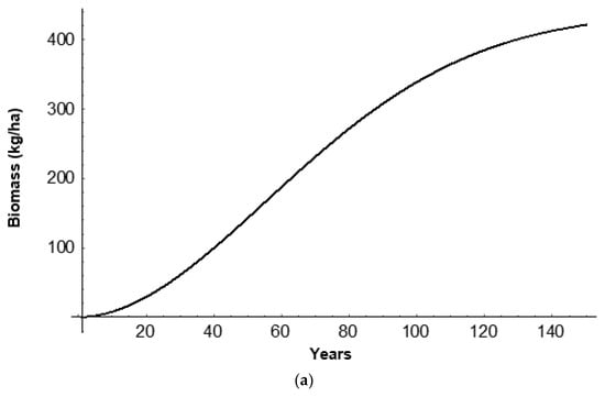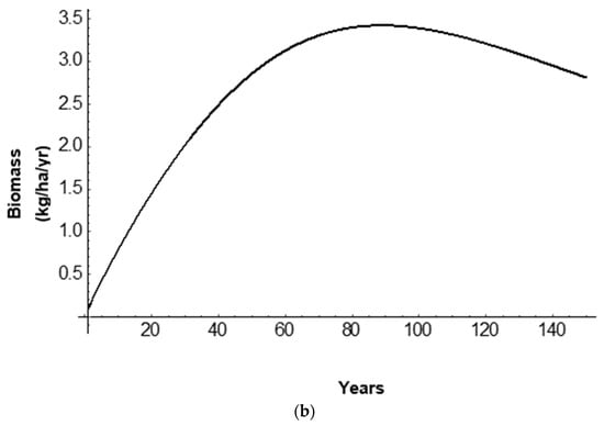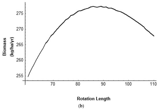 where a defines the asymptote for a defined area, b and c are the shape parameters and t is the number of years (Figure 1). This formula models the biomass (or other metrics such as roundwood) in kg/ha vs. time. The total wood mass could represent whole-tree chipping and the total stem mass could correspond to the harvest of multiple wood products. The Weibull function has certain advantages for fitting data compared to other monotonic growth functions, such as the Gompertz or logistic functions. The MAI value (Figure 1b) at t is simply f from Equation (1) divided by t. A simple numerical search of the MAI values provides the age T of the peak MAI, which is the optimal rotation for the MSY. Several factors can modify the conclusion that the peak MAI is optimal. If older trees become progressively more valuable due to, for example, more knot-free wood for high quality lumber or veneer, then the optimal rotation age will increase. Conversely, if older stands tend to have a deteriorating quality (e.g., heart rot, staining, mortality), then the time of the optimal harvest is more immediate. These factors can be accommodated by including an age-dependent wood price, as shown in the empirical examples below, or by discounting the yield for damage risk.
