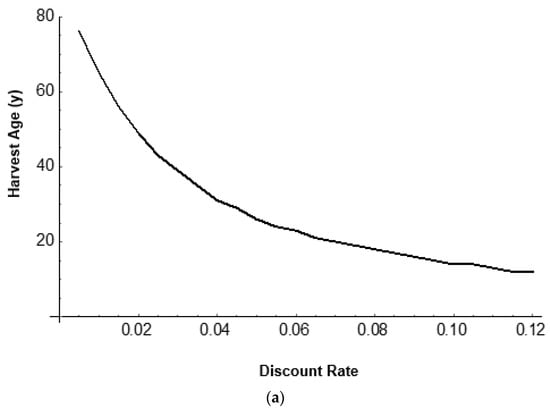 The Faustmann formula for the LEV can yield biologically implausible results. The rotation age based on Equation (3) is generally younger than the age of the peak MAI [12], notwithstanding the special case developed by Binkley [8]. As shown in Figure 2a, the maximum LEV is obtained at younger ages as the discount rate increases. Compared to a maximum MAI age of 89, a discount rate of even 8% provides a rotation age of approx. 20 years for this yield function. This rotation age gives a harvest only 10% of the peak MAI harvest at the stand scale or 62.5% of the ownership scale annual harvest under an even flow regime. The shorter rotation also increases the annual planting costs by 4.45 times due to more frequent harvests. The graph in Figure 2a shows that the rotation age approaches the age of the maximum MAI (89y) as the discount rate nears zero. However, the LEV at a zero discount rate is undefined in Equation (3). That is, the PV for a single rotation (2) with r = 0 yields a rotation age equivalent to the age of the maximum MAI (the forest rent rotation). However, the LEV in Equation (3) at r = 0 is an infinite sum since future harvests are not discounted, and it cannot be used to find the rotation age. For larger discount rates, the LEV decreases to very low levels since the age of the harvest is so low that the yields from (1) are trivial. These problems mean that this approach needs further analysis, despite its elegance. The rents framework can be suggested as an alternative.