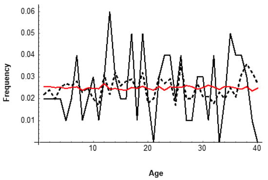 Age distribution for ownerships of different sizes when stands are acquired by a landowner randomly over the ages of 1–40 years old (single realization of each case). Solid line = 100 stands. Dashed line = 1000 stands. Red line = 50,000 stands. The distribution converges to uniform with the number of stands, as expected.