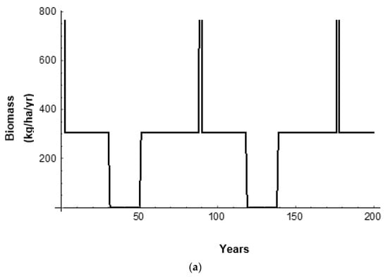 Multiple authors have argued that longer rotations are necessary to sequester more carbon (C) for climate change mitigation (e.g., [24,25,26]). It has been argued that managing forests for greater C storage (higher inventory levels) will negatively affect economic returns (e.g., [27]). The analyses presented here show that this is true (i.e., income is reduced) for rotations longer than the age of the maximum MAI. This means that landowners would need to be compensated for this loss. Carbon markets do provide incentive payments to landowners to extend rotations, but the present analysis suggests that these payments may be inadequate if based on Faustmann analyses. Ironically, for rotations determined using a Faustmann approach for any interest (discount) rate greater than zero, longer rotations could bring the forest closer to the sustained yield rotation age, thus increasing the harvest volumes and landowner income (see Figure 2). Since forests managed for the MSY produce the most harvested wood, longer rotations will result in less wood, and thus C, stored in products and landfills [28]. This aspect is rarely considered. The financial (Faustmann) rotation to the MSY rotation in terms of C storage can also be compared. Using the example above with an 8% interest rate, the mean standing wood C (from Figure 1) of a regulated MSY forest (89-year rotation) will be 12 times higher than the Faustmann (20-year rotation) case. Using MSY rotations in general leads to higher average C standing stocks in trees at the ownership scale than Faustmann financial rotations at any interest rate greater than zero.