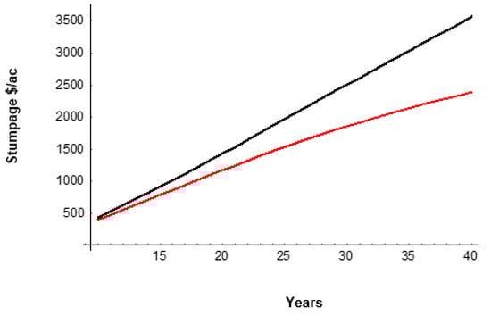 A complication arises when the growth and yield data for southern pine are considered. An analysis based on the total stumpage value from Yin [9] (Figure 5) showed that the per acre income was a nearly linear function of the age up to the age of 40. Note that this is for merchantable volumes whereas Figure 1 is for the total volume. In any case, Figure 1 is nearly linear in the central portion of the graph. This means that the MAI curve (Figure 6) turned down with the age but never had a maximum within the 40-year simulation, so the peak MAI could not be determined. The maximum MAI was not reached at typical harvest ages or even by age 40 in this case. Delaying the harvest to age 40 compared to age 25 would increase the MAI, and thus landowner annual income by approx. 13%. Delaying the harvest to age 40 compared to age 20 would increase landowner annual income by 34%. These effects were dominated by the transition of growing trees to the sawtimber size class after age 20. The planting trials in Virginia and North Carolina showed that, across the initial tree spacings, the harvestable volume curves with time were also roughly linear out to year 25 [14]. Again, to age 25 there was no peak in the MAI curve. The yield tables and planting trials for loblolly did not extend long enough to determine the optimal age for sawtimber. However, the wood in a stand may be at risk from fire, disease, insects and windthrow. This can be incorporated into a rents framework without switching to the Faustmann approach. For a growth model given by Equation (1), the actual harvest in year t after depreciating for a constant risk with age is shown by Equation (11).
