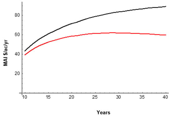 where fp is the wood volume per ha at the age of the peak MAI, A is the area of the entire ownership (ha), T is the rotation age (yr), v is the value per unit volume harvested (stumpage) and ć is the annual cost per ha (property tax, road maintenance, etc.). The middle term reflects the annual replanting cost (area A/T replanted/yr). Note that the planting costs c in a given year are not from the same stands as those harvested in that year. Instead, they are from all the stands harvested the previous year. Note that some forest types, such as many broadleaf species, can be regenerated naturally with no replanting cost. This also has implications for any assumption that planting costs accumulate interest charges until the harvest, with this being a driver for earlier harvests. The peak MAI provides the stand rotation age T that corresponds to the MSY for a forest [3,12]. This can be determined by a numerical search using Equation (4b) for different T values, allowing T to also affect the yield. For a forest with multiple species and productivity, this analysis can be conducted for each category (e.g., pine, hardwood, low vs. high site index). The MSY results in the maximization of the annual cash flow for a landowner with many stands. In a rent framework, the costs are treated as repeated annual expenses across the ownership or a class of land (such as all the parcels that will be thinned or fertilized). The planting costs are for all the stands replanted in a given year, not just a focal stand, as presented in the Faustmann formula, as well as the property tax of the ownership, road maintenance costs, etc. The other periodic costs, such as fertilization, can be added to Equation (4b). That is, the expenses are not capitalized. An infinite series of annual costs and income with and without a particular treatment can be compared to evaluate whether that treatment should be conducted.