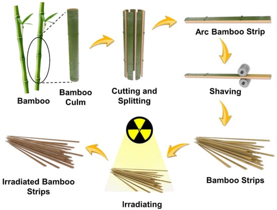 Gamma-ray irradiation treatment was carried out at Anhui Union Radiation Chemical., Ltd. (Hefei, China). The radiation source is 60Co-gamma radiation source with 0.7 million curies. The schematic diagram of gamma-ray irradiation treatment is illustrated in Figure 1, where Irradiation dose (KGy), MC (%), and irradiation dose rate (KGy/h) were selected as the factors of the L9(33) orthogonal experiment. Each factor included three levels, as shown in Table 1. The orthogonal experiment results were analyzed by the analysis of variance (ANOVA). Six bamboo strips were treated for each group. The results were averaged.