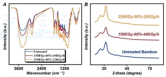 Figure 2A presents the FT-IR curves of untreated and gamma-ray irradiation-treated bamboo strips. The peak at 3400 cm−1 and 2900 cm−1 was assigned to the OH stretching vibration and C-H stretching vibration groups, respectively. With the increase in the irradiation dose, the peak intensity of functional groups at 3400 cm−1 and 2900 cm−1 decreased. This might have resulted from cellulose degradation and the free hydroxyl (–OH) polymerizes, which formed aldehyde, ketone or carboxyl groups [18]. The peak at 1240 cm−1 and 1740 cm−1 was assigned to the C–O strength vibration peak and the C=O stretching vibrations of hemicelluloses, respectively. The intensity of these peaks at 1240 cm−1 and 1740 cm−1 decreased significantly due to the degradation of hemicellulose by deacetylation reaction [32]. The peaks at 1513 cm−1, 1600 cm−1, and 1423 cm−1 were the skeletal vibrations of the benzene ring [58]. With the increase in the irradiation dose, the peak at 1513 cm−1, 1601 cm−1, and 1423 cm−1 decreased, which indicates the degradation of lignin.