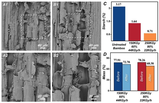 The morphological characteristics of the bamboo strips. SEM images for the untreated bamboo at 800× (A1) and 1600× (A2); SEM images for the gamma ray irradiation-treated bamboo at 800× (B1) and 1600× (B2); (C). Starch content for untreated and gamma ray irradiation-treated bamboo; (D). Weight loss ratio for untreated and gamma ray irradiation-treated bamboo.
