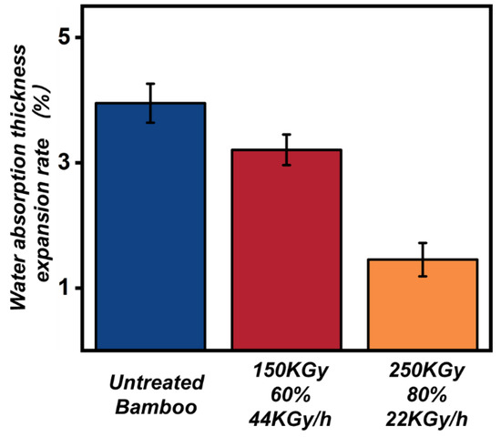 The results of the water absorption thickness expansion rate for both untreated and gamma-ray irradiation-treated bamboo strips are shown in Figure 5. It is obvious that the water absorption thickness expansion rate declined after gamma-ray irradiation. As the radiation dose increased, the water absorption thickness expansion rate decreased. This could be attributed to the degradation of cellulose and hemicellulose after gamma-ray irradiation which decreased the number of free hydroxyl groups [66]. The decrease in the free hydroxyl group led to a decrease in bamboo hygroscopicity. With the radiation of doses increasing, the number of free hydroxyl groups was reduced, as shown in the result of FT-IR (Figure 2A). The decrease in bamboo hygroscopicity was beneficial to the dimensional stability and mildew resistance of bamboo.