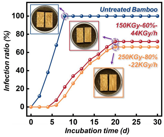 Aspergillus niger, a normal fungus easily infected by bamboo, was used to investigate mildew resistance. Figure 6 shows the mildew resistance of the untreated and gamma-ray irradiation bamboo strips. It can be seen that untreated bamboo strips were prone to mildew infection. The mycelium of Aspergillus niger was observed on the sample on the second day. It only took eight days for Aspergillus niger mycelium to cover the entire surface of the untreated bamboo. However, the infection rate of mildew and the final infection rate of the bamboo strips were alleviated after gamma-ray irradiation treatment. With the increase in the irradiation dose, the control efficacy of bamboo strips increased significantly. When the radiation dose was 250 KGy, the control efficacy reached a maximum value of 75.4%. On the one hand, the degradation of starch and other nutrients by irradiation reduced the nutrient source required for fungus growth. On the other hand, the cross-linking reaction and hemicellulose degradation resulted in a significant reduction in the free hydroxyl group, which reduced the hygroscopicity of bamboo. In addition, gamma rays could pass through the bamboo strips easily and kill the hidden eggs and dormant spores of insects and fungi, destroying fungi growth and their reproduction [46].