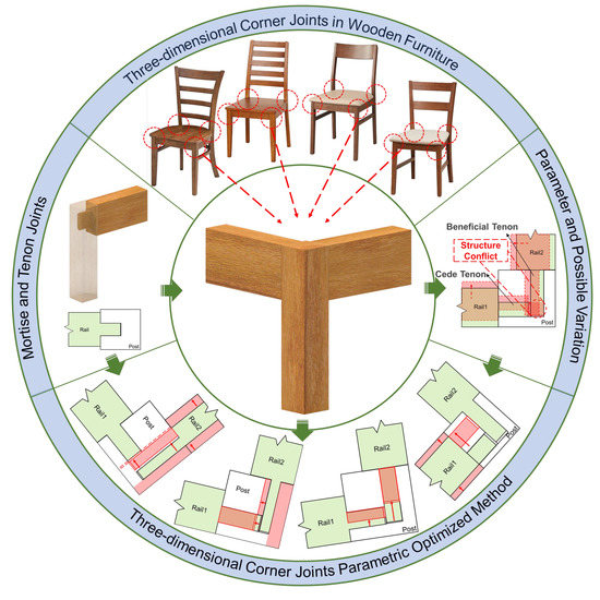 This research includes three steps. First, according to the parameter value calculation formula of mortise–tenon joints, the ideal value range of each parameter is obtained. Second, an optimized method for the structure of three-dimensional corner joints in wooden furniture was derived based on the correlation between different parameters. Finally, using collected examples of the basic dimensions of three-dimensional corner joints, calculations were performed using the ideal method for determining the basic dimensions covering the value range and the parametric optimized method. Data analysis and comparison will be conducted.