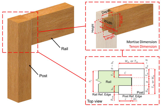 Mortise–tenon joints are often used for wooden furniture assembly. Currently, the design and processing workflow for mortise–tenon joints in most Chinese enterprises is roughly as follows: First, make drawings and 3D models based on parts’ dimensions. Then, the mortise–tenon joint dimensions are designed according to each part’s width and thickness and added to the drawing and 3D model. Finally, the dimensions are transformed into processing code through the Computer Numerical Control (CNC) machining program, and the code is sent to the CNC machine tool for processing [9,10]. In the case of the diverse types, complex structures, and variable dimensions of mortise–tenon joints, relying solely on ideal traditional design methods will result in a large amount of repetitive work. At the same time, there are no standard dimensions for mortise–tenon joints. The unreasonable mortise–tenon joints parameter dimensions determination method seriously affects the digital production efficiency and quality of wooden furniture structures [11,12].