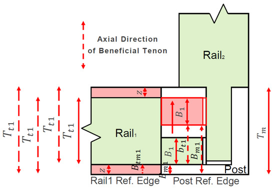 In the axial direction of the beneficial tenon, the depth of the beneficial mortise (), and the width of the cede mortise () are the same in Formula (1). The margin thickness from the cede mortise to the post reference edge (), and the margin thickness from the rail1 reference edge to the post reference edge () are the same as in Formula (2). As shown in Figure 4, based on the different thicknesses of the rail1 () and the post (), the margin thickness from the cede mortise or tenon to the rail1 reference edge () can be further optimized for the range of values.