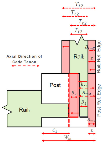 where is rail1 thickness; is post thickness; is margin thickness from cede mortise–tenon to rail1 reference edge; is cede mortise width; z is the fixed value of the safety drilling margin thickness from mortise to the post edge. All parameter values are in units of mm. In Formula (3b), can also be replaced by .