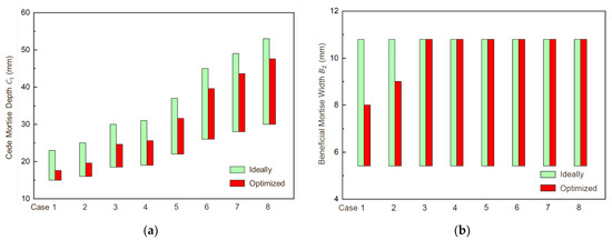 Next, an analysis was conducted on the value range of the cede mortise depth () and beneficial mortise width () before and after optimization. As shown in Figure 6, the value range of for all cases has been reduced. Especially for the parts with smaller post widths, which are 28 mm and 30 mm, respectively, the optimized method can narrow the value range of to a narrower level. It is reduced from 15~23 mm and 16~25 mm to 15~17.6 mm and 16~19.6 mm, respectively. As for the value range of , only values of 28 mm and 30 mm have been reduced, while others remain unchanged. Therefore, the parametric optimized method can obtain a more reasonable value range, especially when the post width is small.