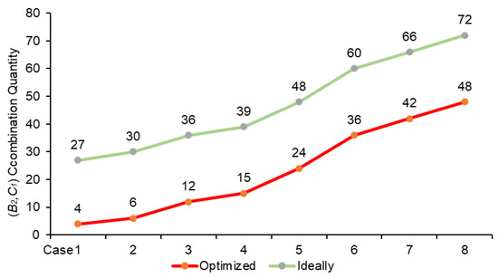 Based on optimizing the value range of the cede mortise depth () and the beneficial mortise width (), () possible cmbinations of the cede tenon axis were further derived, as shown in Table 3. When is small, the can be larger, and vice versa. When is known, a more refined range of the other dimension can be quickly obtained, and vice versa. After obtaining the possible () combinations, the quantity of () before and after optimization was compared, as shown in Figure 7. Compared with the ideal () combinations, the quantity of optimized combinations for case 1 was reduced by 23, and the quantity of combinations for the other 7 cases was reduced by 24. When the post width () dimension is at the minimum value of 28 mm, the quantity of combinations is only four. This is because, when the is smaller, is limited by the other parameter dimensions in that axis to avoid structure conflict. Thus, regardless of the dimensions of the joints, the parametric optimized method of the cede tenon axis can stably reduce the quantity of () combinations, especially for three-dimensional corner joints with small post width dimensions, which can reduce the () combination quantity to a low level and facilitate selection of the appropriate values.