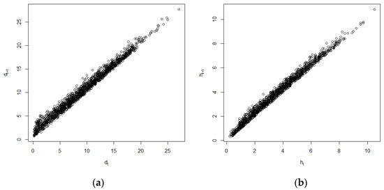 Plots of individual tree measurements: (a) diameter measurements, in cm, at year t (dt) and at year t + 1 (dt+1); (b) height growth measurements, in m, at year t (ht) and at year t + 1 (ht+1).