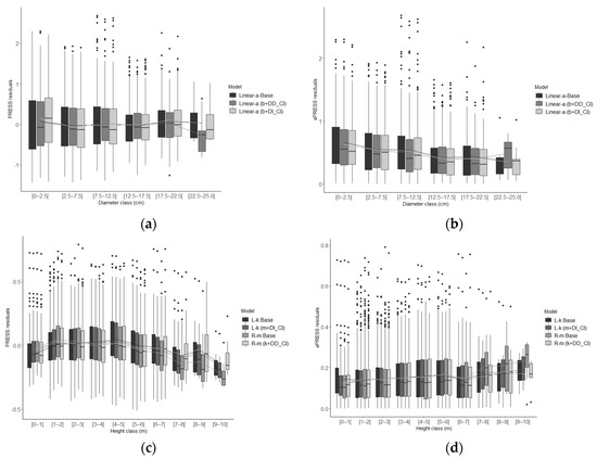 Boxplots and mean (lines) from diameter and total height growth PRESS (a,c) and aPRESS (b,d) residuals according to size classes: (a,b) prediction residuals statistics for the three diameter growth models: Linear-a base model (Linear-a Base); Linear-a when added the distance-dependent competition index N > di to b parameter (Linear-a b + DD_CI) and Linear-a when added the distance-independent competition index CC > di to b parameter (Linear-a b + DI_CI); (c,d) prediction residuals statistics for the four height growth models: L-k base model (L-k Base); L-k when added the distance-dependent competition index Sumh to the m parameter (L-k m + DD_CI); R-m base model (R-m Base) and R-m when added the distance-independent competition index RS to the parameter k (R-m-N k + DI_CI).