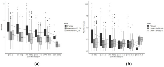 Boxplots and mean (lines) from diameter growth models validation according to size classes: (a) residuals and (b) absolute residuals from validating with three year growth data diameter the P-Linear diameter growth model (P-Linear), Linear-a when added the distance-dependent competition index N > di to b parameter (Linear-a b + DD_CI) and Linear–a when added the distance-independent competition index CC > di to b parameter (Linear-a b + DI_CI).