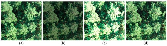 Common augmentation techniques include flipping the image, moving the object position in the image, adding Gaussian noise, improving image contrast, and exposing the image. The crowns in this study exhibited similarities in spectral features. To capitalize on these features, we augmented the dataset by applying operations that manipulate the brightness levels and add Gaussian noise, enhancing the crown’s color characteristics. Figure 4 shows a set of data enhancement samples.