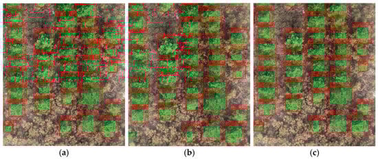 (a) Faster-RCNN detection effect image; (b) YOLO detection effect image; (c) SSD detection effect image. The red square is the crown detected by the model.