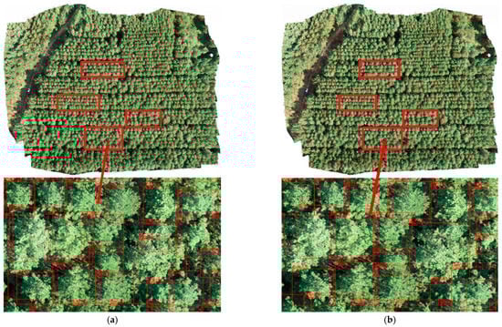 However, in the mature forest, the original Faster-RCNN model performed poorly. The objective of this research was to enhance the performance of Faster-RCNN and enhance its versatility when operating in mature forest environments. Figure 11 shows the crown-detection effect of the two models in orthophoto images.